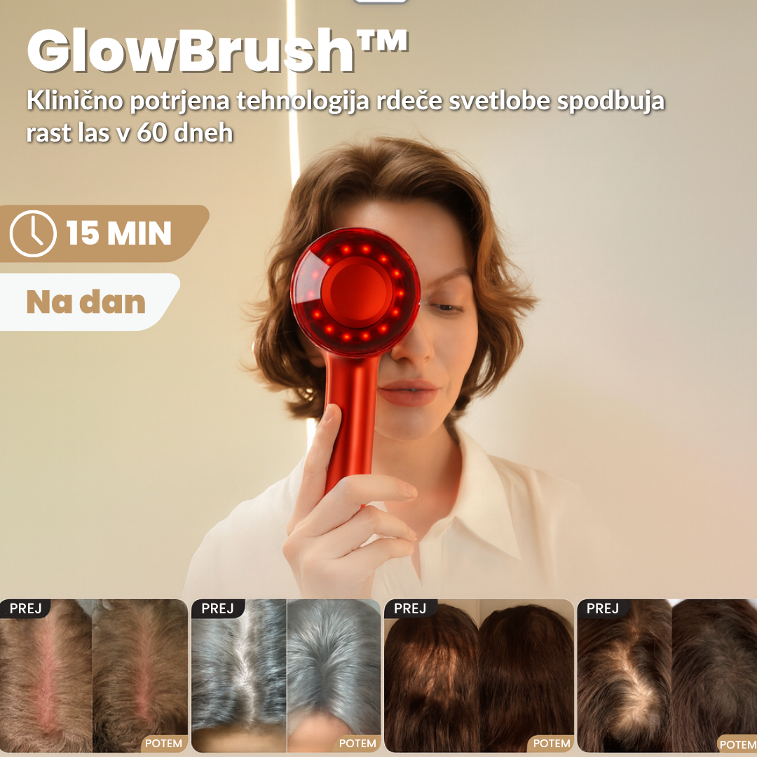 GlowBrush™ – pametna masažna krtača za lase združuje rdečo svetlobo in mikro tokove, da okrepi lasišče in spodbuja rast las.